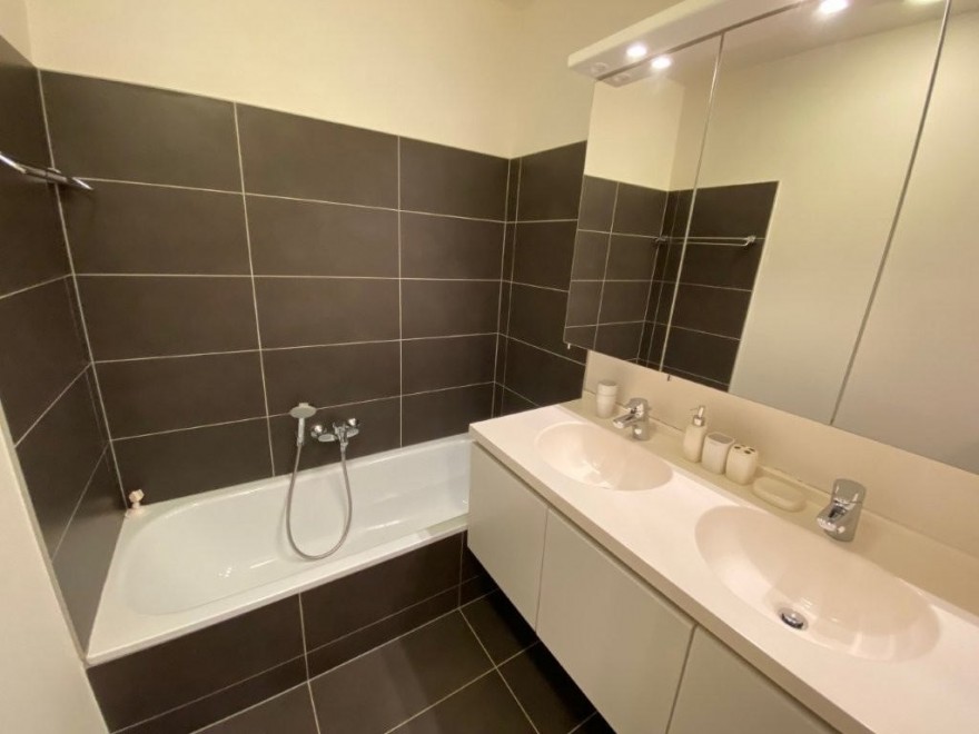 Auderghem : à proximité du métro Hermann-Debroux, dans une nouvelle construction moderne, bel appartement meublé avec goût au 1er étage, desservant séjour et salle à manger, cuisine ouverte super équipée, buanderie équipée. 2 chambres, salle de bain et salle de douche. Parquet partout, vidéophone, double vitrage, terrasse, possibilité de louer un parking ( extra). Proche transports et commerces. PEB D. A découvrir !!! www.atlasrealestate.be. Visites : +32 2 734.24.54 - Mob +32 475 38 69 05